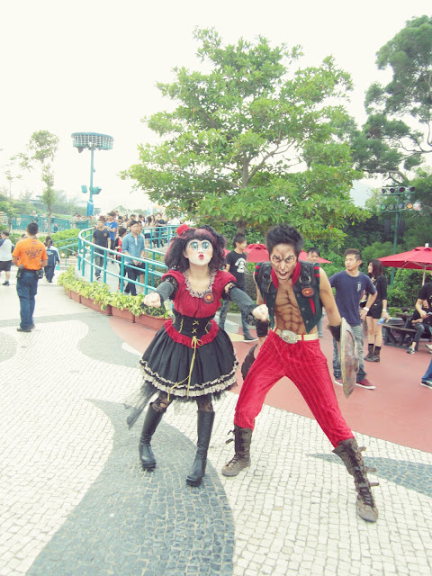 So seeing as how i am a complete loner out here in Hong Kong, I had no exciting Halloween party to attend. But i did, however, do one better: I went to Ocean Park. I mean what screams Halloween more than haunted houses and zombies and ghosts. Unfortunately, I wasn't as cool as others and had no costume. Sad face. But my sister and her friends (yep i hung out little high school kids) were cool and dressed up. My favorite was Byrant, (blog here) who was "the devil wears prada". He was going to wear his Prada shoes (to an amusement park I might add) but decided to just settle with Prada glasses. #fashionistaproblems.The haunted houses were pretty good, if i was allowed to I would have tired to snap a few shots. There were a few epic things like this ghost FLYING/jumping out at you, whom I fived whilst screaming. That is multi-tasking right there. There was also like a butcher house area that was quite scary, having fake rubber pigs slap you around is not my idea of a good time.